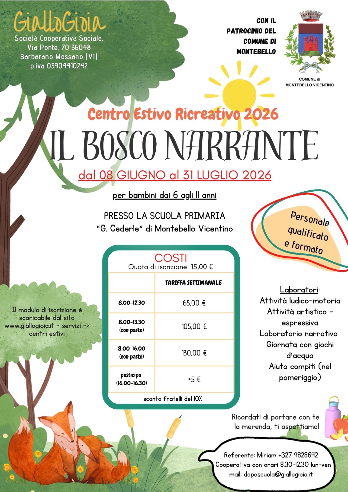 La società cooperativa sociale GialloGioia con il patrocinio del Comune propone il Centro Estivo ricreativo 2026 - Il Bosco Narrante per bambini dai 6 agli 11 anni