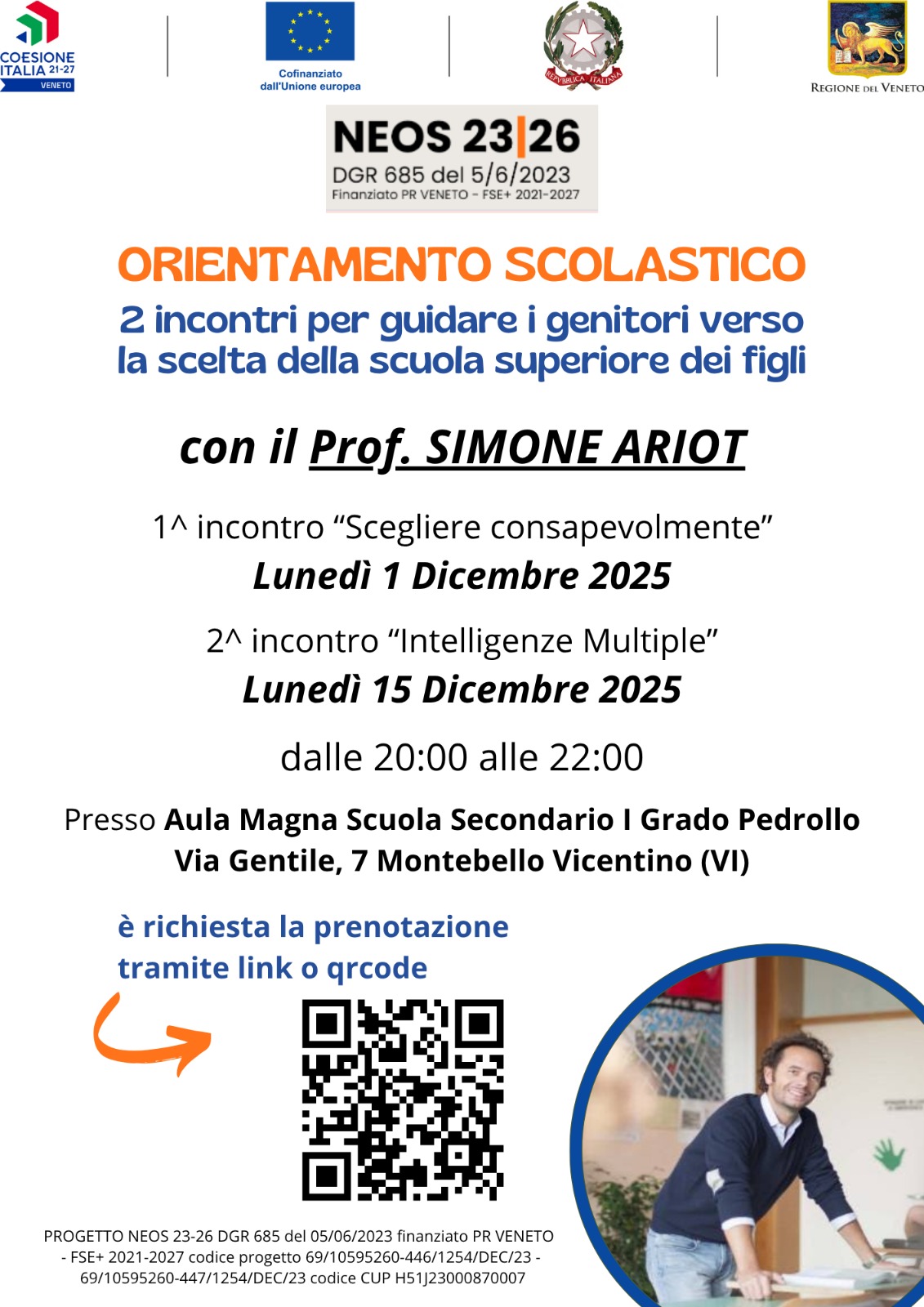 Presso l’aula magna della scuola secondaria di primo grado “Pedrollo” (via Gentile 7) si terranno due incontri, condotti dal prof. Simone Ariot, sull’orientamento scolastico, al fine di guidare i genitori verso la scelta della scuola superiore dei figli.