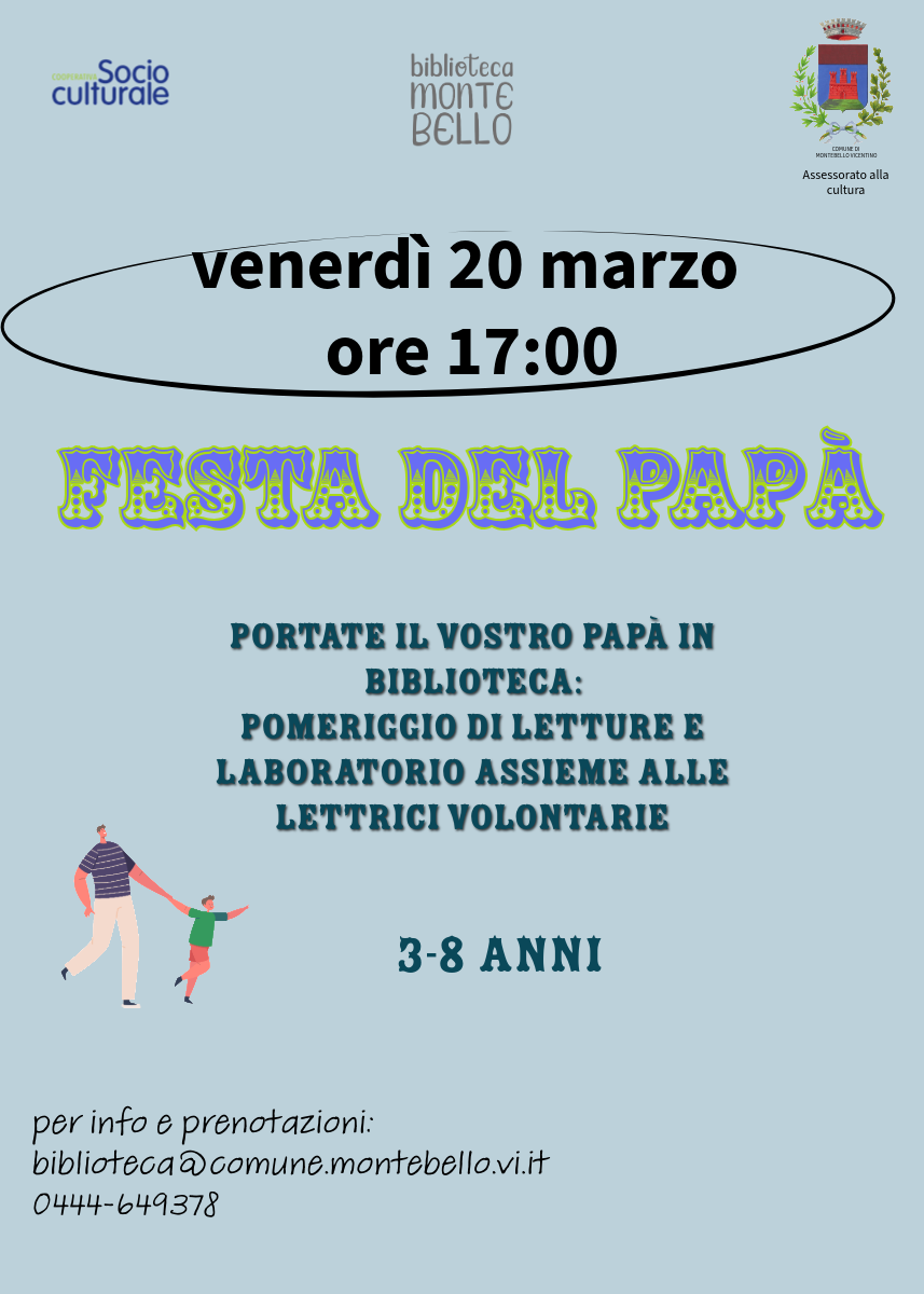 La Biblioteca Comunale insieme all'Assessorato alla Cultura, in occasione della festa del papà, invita tutti i bambini dai 3 agli 8 anni e i loro papà a un pomeriggio di letture e laboratori assieme alle lettrici volontarie.