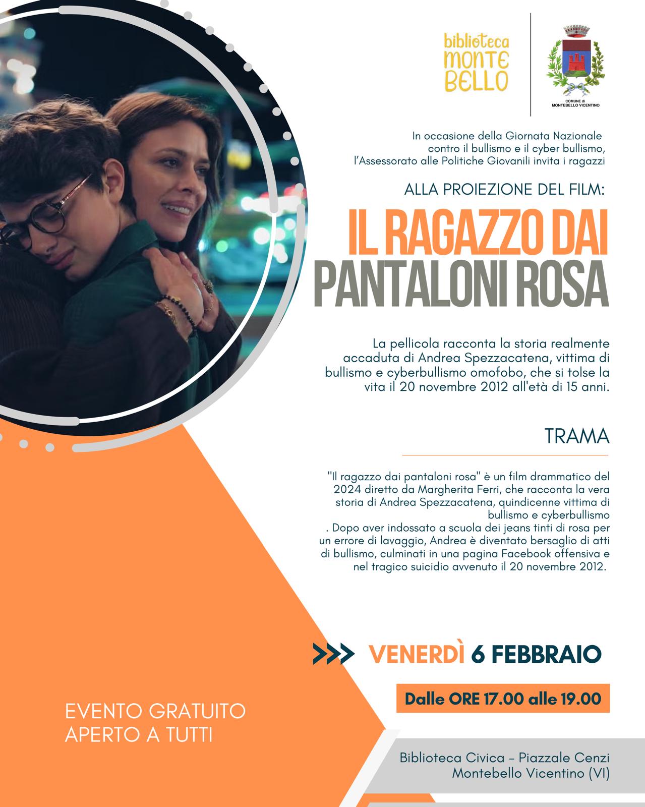 L'Assessorato alle Politiche Giovanili, in occasione della Giornata Nazionale contro il Bullismo e il Cyberbullismo, invita tutti i ragazzi e le loro famiglie alla proiezione del film "Il ragazzo con i pantaloni rosa".